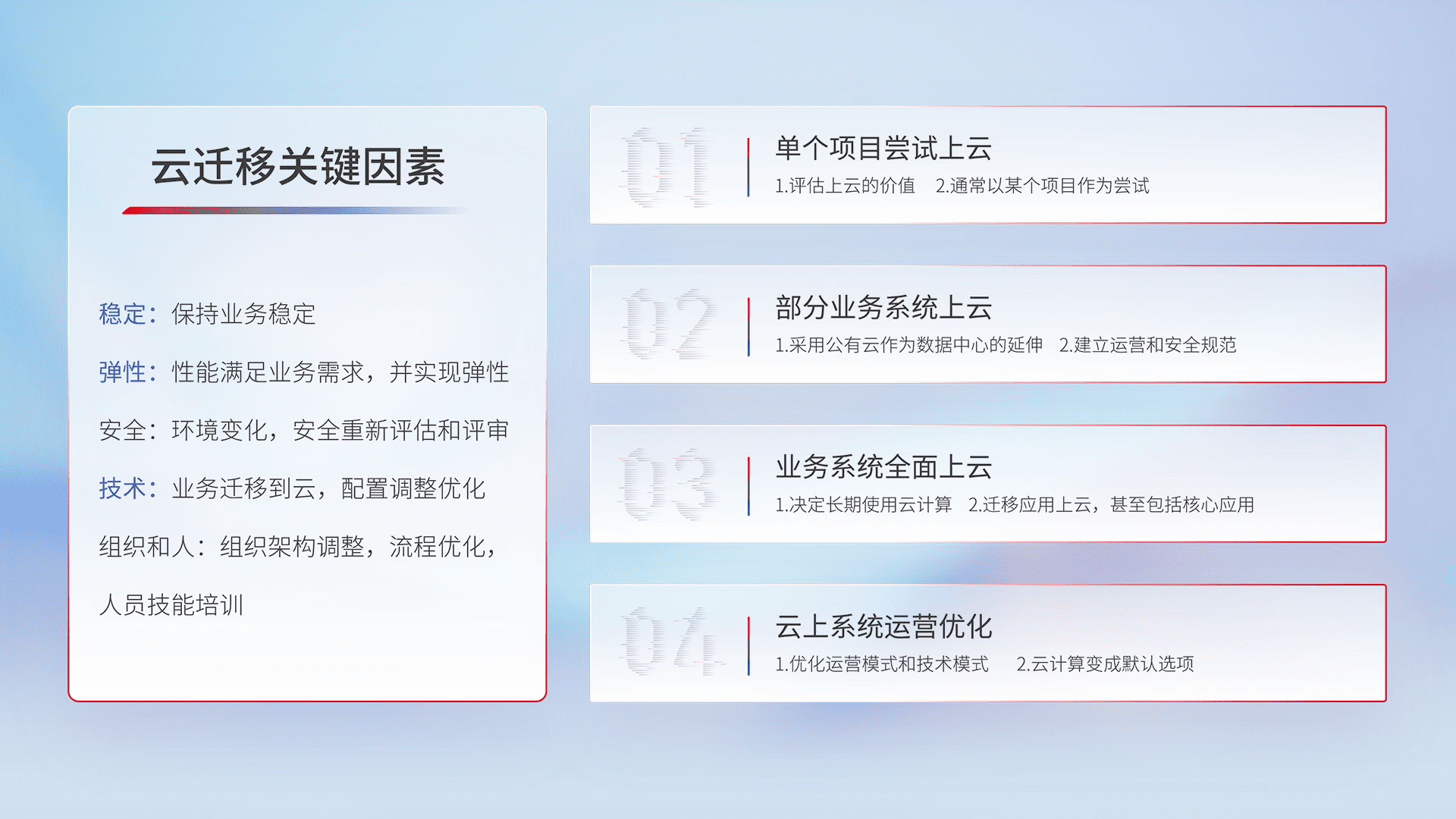 结合实际业务,,,从规划设计、、、云平台选型、、、云原生改造、、、、数据迁移、、集成交付,,,,迁移全过程为客户识别最佳上云路径,,,,做好风险识别管理,,,设计网络架构、、身份权限、、安全审计合规、、、、操作审计、、、日志审计、、、监控告警策略、、多站点容灾设计等,,,对云上基础设施进行整体规划,,,提升IT治理水平,,以满足弹性、、、高可用、、、、高性能的需求。。。。