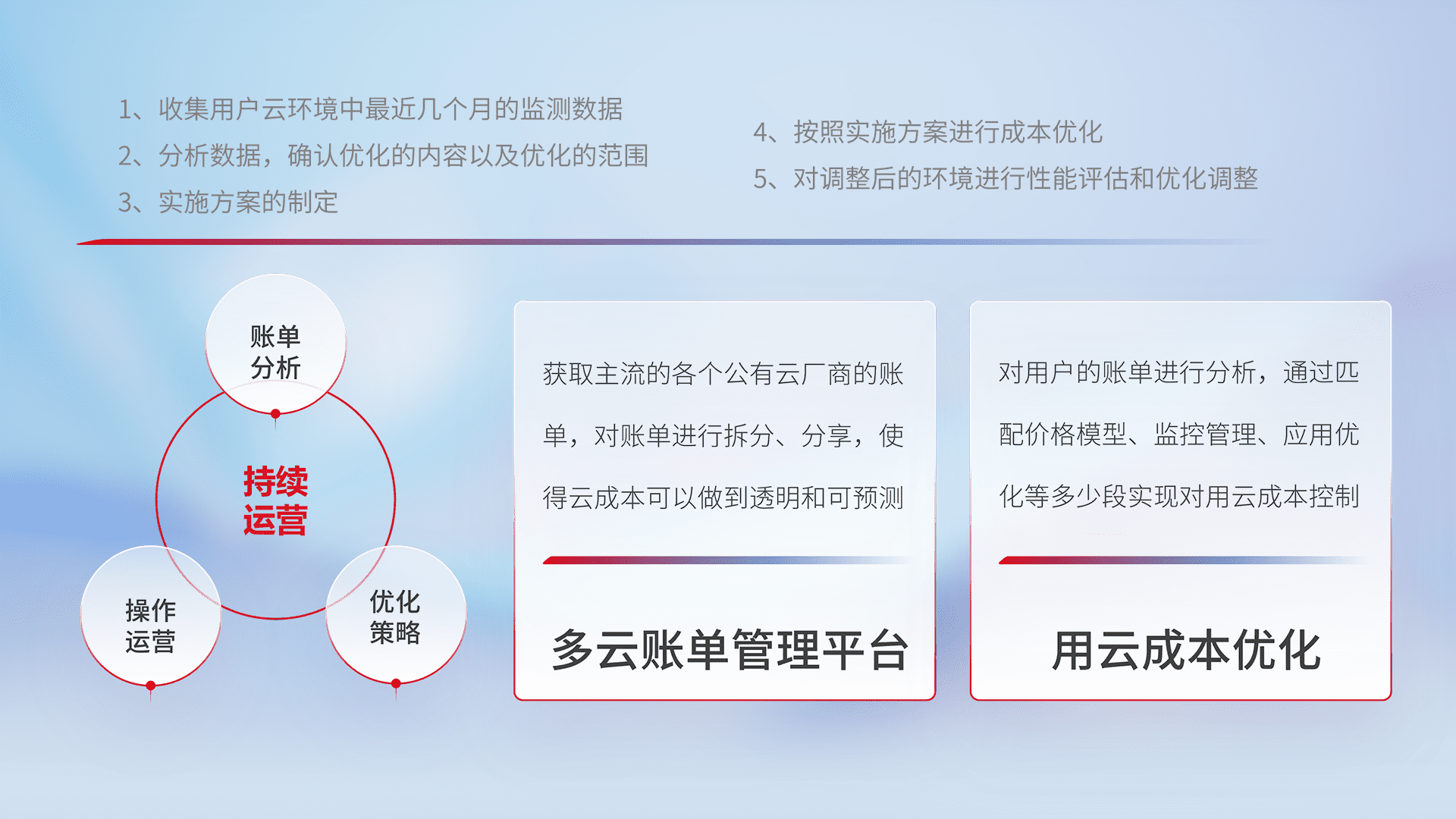 通过多云纳管,,,以统一的资源数据模型把客户的云资源进行抽象和封装,,,进而实现对多云资源的统一操作,,保障云资源管理的可靠性、、、、稳定性与可用性。。。。量身定制化运维内容,,,,配置、、、开发运维、、补丁管理、、、、备份、、监控、、认证和访问管理、、审计和日常巡检等,,,,保障在用云过程中的可靠度,,,稳定度以及高可用率。。。