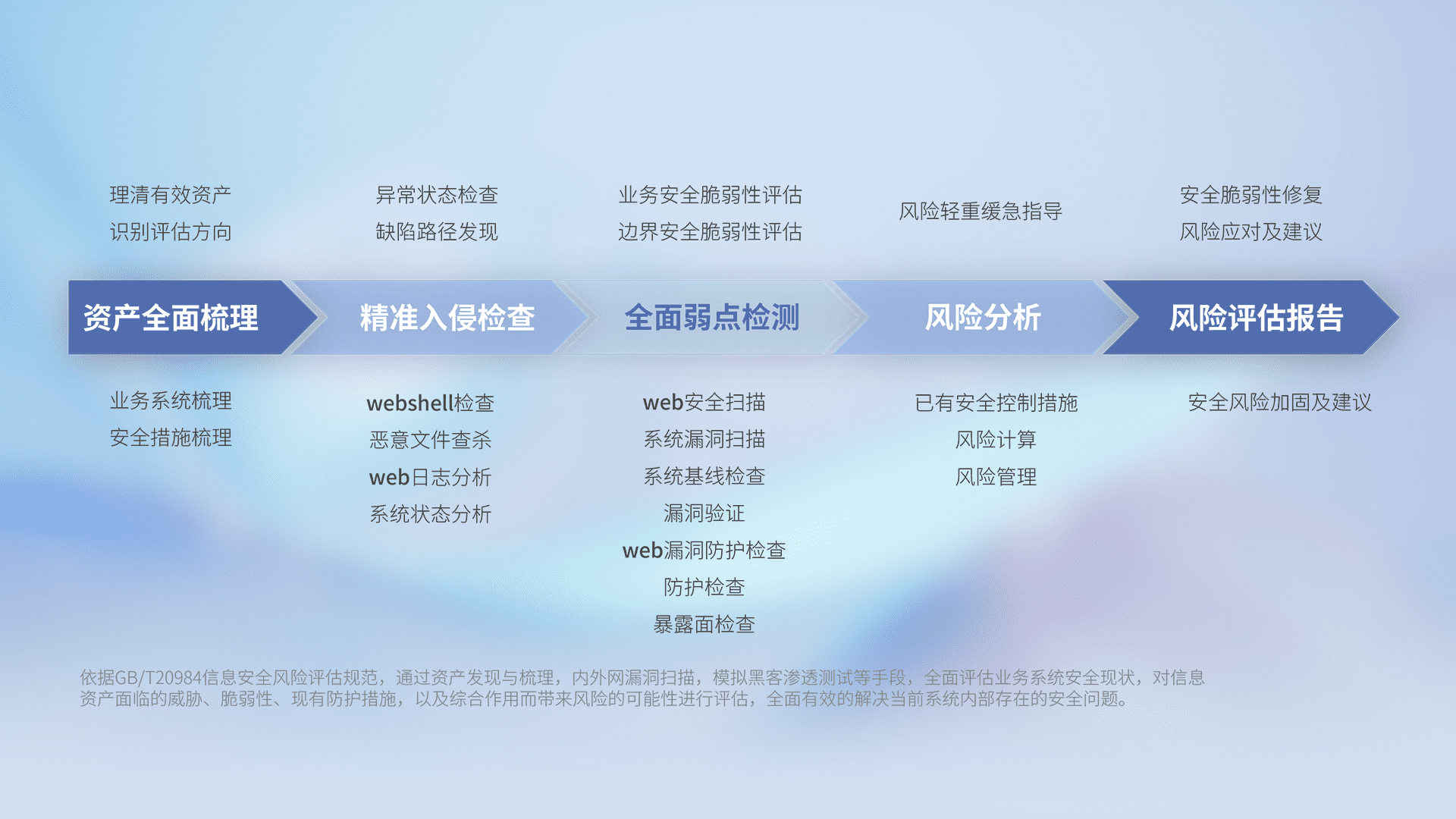 针对客户行业特性,,,,以专业的安全服务+多厂商联合解决方案提供专属的一站式安全管理服务,,,帮助客户全面感知网络空间威胁,,,,基于识别、、检测、、、分析、、防护、、、监测、、、响应的服务理论模型,,,,从方案咨询、、、、集成交付、、、评估验证、、优化加固、、运维运营,,,,致力于为客户提供完整的闭环管理式安全服务。。以实战经验为客户打造高抵御风险的安全体系,,,帮助客户发现威胁、、、、对抗威胁、、、、处置威胁,,不断积累安全对抗能力,,,持续保障数字化安全。。
